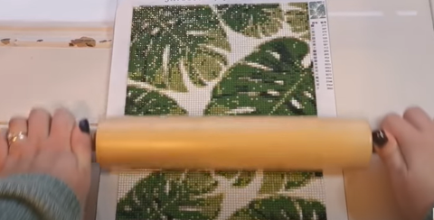 The first thing that I’m going to do is getting my rolling pin.So I’m going to roll over the diamonds to make sure they’re all sitting flat on the surface as flat as possible.